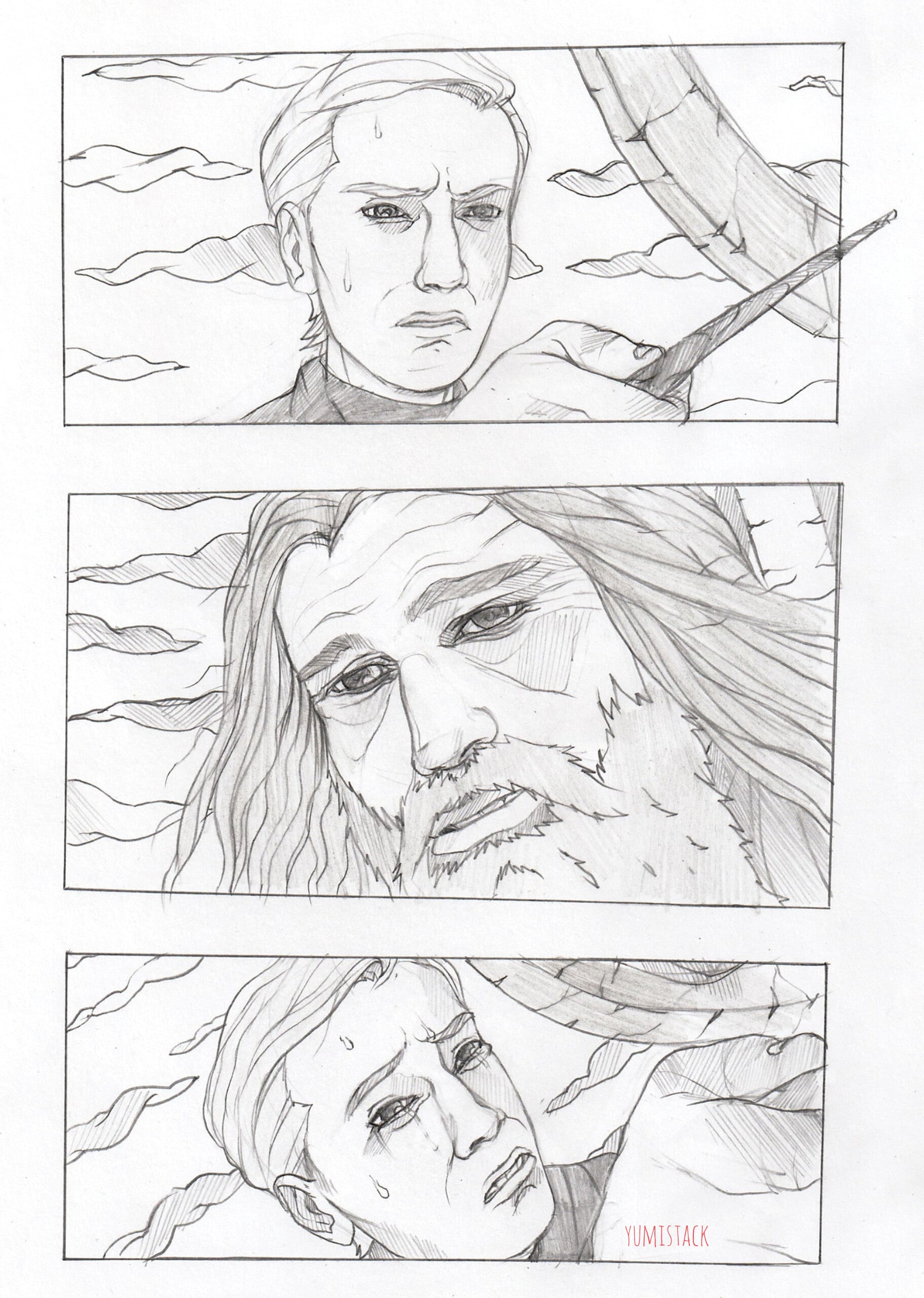 The sequence strongly suggests a moment of high drama, confrontation, or tragic loss involving these two characters, possibly set in an action or fantasy context due to the intensity and the background elements.