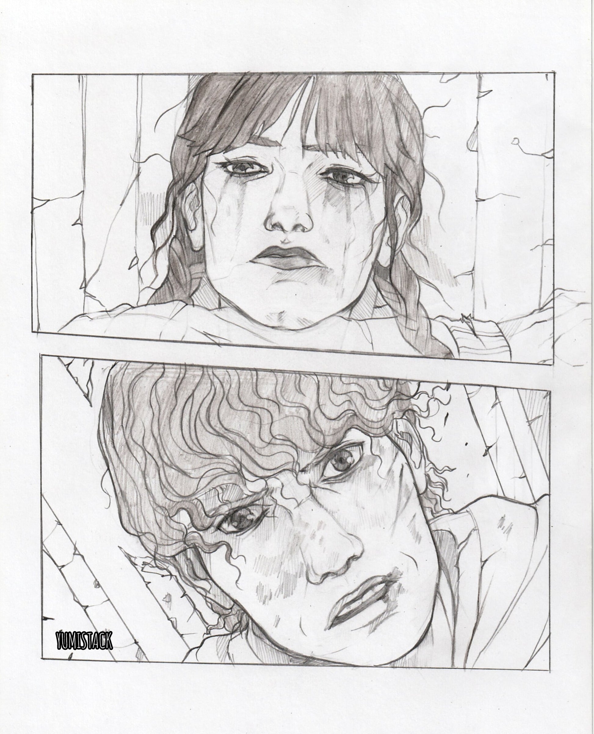 The drawing effectively captures a high-stakes emotional moment in a story. The character design and paneling are typical of manga, and the sharp contrast in expressions—the woman's heartbreaking question and the man's shocked silence—creates significant tension